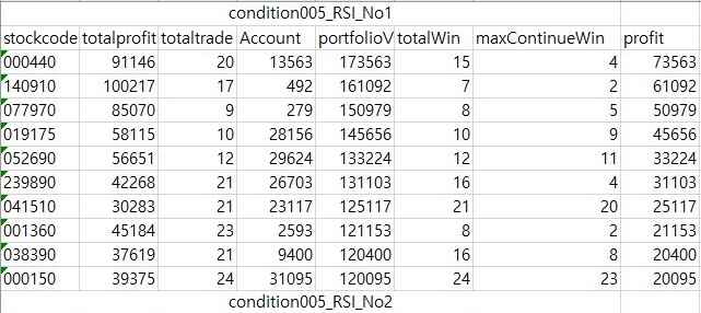 먼저 지난번 포스팅에서 제대로 마무리를 짓지 않은 condition005에 대해서 결과를 올려 보고자 합니다. 일단 여기서는 위 스크린샷에서 볼 수 있는 것처럼 우선 RSI지수를 기반으로 하는 매수/매도 룰에서도 무언가 결과가 보이기 시작했습니다.