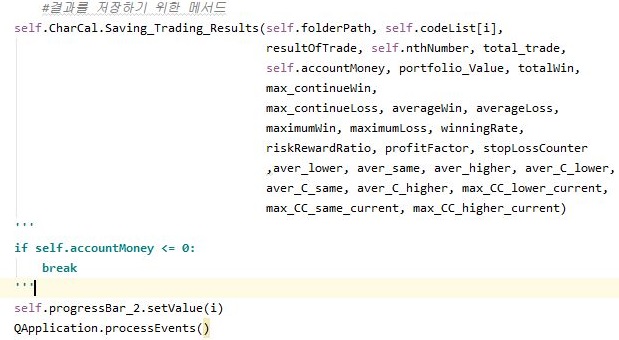 그리고 나서 다음으로 진행하기 위한 것으로는 위 스크린샷에서 볼 수 있는 것처럼, 일단 단순히 현금이 0원 이하만 되는 것이 아니라, 포트폴리오 가치 = 주식의 가치도 0원이 되는 상황까지 와야 그 종목의 백테스트를 그만 두라고 명령을 내려 줍니다.
