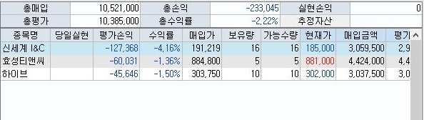 다만 문제가 하나 있다고 하면, 매입가와 현재가가 같지만, 이게 손해와 이익 제로가 아니라 이 상태만 해도 수수료 때문에 손해로 집계가 된다는 점이.......... 무언가 할말을 잃게 만들기는 만든다는 생각이 듭니다.