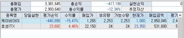그렇게 해서 보니, 보유하고 있는 주식의 가치하락으로 인해서 오히려 지난번 보다 더 계좌의 상황이 악화되고 있는 것을 확인할 수 있었습니다.