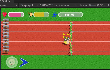그리고 나서 장애물, 여기서는 허들인데 이거 들이받고 죽는 애니메이션을 만드는데 성공했습니다. 물론 실제 게임에선 저렇게 한방에 죽지는 않지만, 그래도 좀 많이 조심을 해야 합니다.
