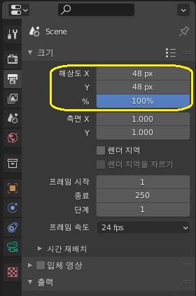 평에 있는 프린터 모양의 아이콘을 선택한 다음에, 해상도에 해당하는 수치를 일단 48 x 48로 맞추어 보도록 합니다. 이렇게 해서 이제 다음으로는...........
