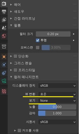 그리고 나서 그 아래로 내려가서, 컬러 매니지먼트가 있는데, 여기다가 필름으로 되어 있는 항목을 표준으로 바꾸어 주도록 하고, 보기 항목을 None로 만들어 주도록 합니다.