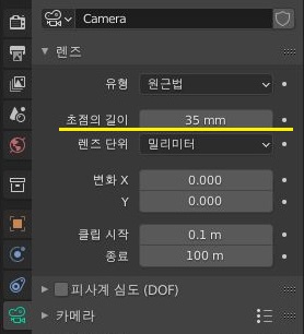 여기 먼저 카메라 오브젝트를 선택하고 나서, 우측에 있는 사이드바 메뉴에서 카메라 아이콘을 선택한 다음에, 원래라면 초점의 길이가 35mm가 아니라 50mm가 되어 있는데, 이를 35로 줄여 보도록 합니다.