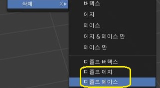 먼저 삭제항목에 있는 디졸브 라는 항목이 있는데, 이건 삭제를 하면서 에지 = 선 만 제거하거나, 페이스 = 면 만 제거하는 기능을 말하는 것 입니다.