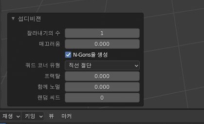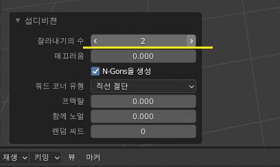 이전에 1이었을 때 4등분이, 2로 올려주니까 9개로 등분의 갯수가 더 늘어난 것을 확인할 수 있었습니다. 이것의 정확한 공식은 저도 모르겠습니다만, 이 숫자가 올라가면 갈 수록 더 많은 조각으로 잘려지는 것을 이해할 수 있었습니다. 이제 다음으로 가야 할 것으로는 역시나.......... 아직도 많은 모델링에 관련된 조작법이 남아 있어서 이를 해결하러 가야 합니다.