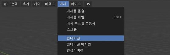 그리고 나서 에지 메뉴에 있는 섭디비젼을 눌러 주도록 합니다. 이렇게 하면 서로 균등하게 선택된 면이 나누어 지는 것을 확인할 수 있습니다.