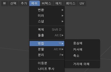 이제 병합에 대해서 알아볼 시간인데, 일단 병합 자체는 M키를 누르면 나타나기 때문에 메쉬에 있는 메뉴를 사용할 일은 크게 없어는 보입니다.