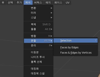 그리고 나서 메쉬 -> 분활 -> 선택인 selection을 선택해 주도록 합니다. 당장 눈에 보이는 기능은 같아 보이지만, 분리와는 결정적으로 차이가 있습니다.