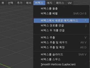 그리고 버텍스 메뉴에 있는 버텍스에서 새로운 에지/페이스 라는 메뉴가 있는데, 이게 바로 페이스를 추가할 수 있는 메뉴라고 보시면 됩니다.