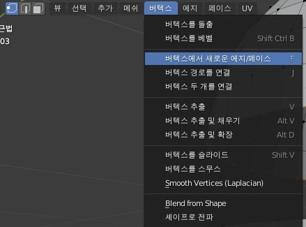 그리고 버텍스 메뉴에 있는 버텍스에서 새로운 에지/페이스 라는 메뉴가 있는데, 이게 바로 페이스를 추가할 수 있는 메뉴라고 보시면 됩니다.