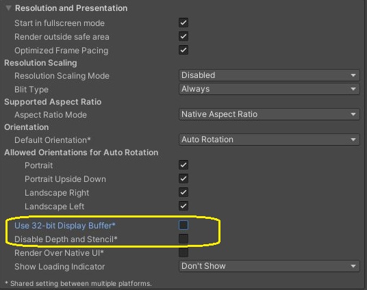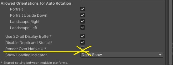 이런 경우에는 위 스크린샷에서 보이는 것처럼 Render Over Native UI 라는 항목을 build시에 제거해 주도록 합니다. 이렇게 했더니, 이번에는 화면이 검게 되면서 아무것도 보이지 않았습니다.