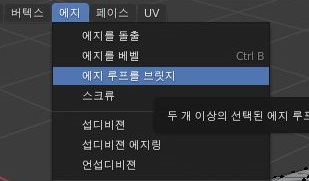 그 다음으로 있는 도구는 바로 에지 루프를 브릿지라고 있는데, 간단합니다. 두개의 에지가 2차원형 도형을 이루고 있으면, 가령 원 두개가 마주보고 있으면, 이 사이에다가 다리 - 면인 페이스를 채운다고 보시면 됩니다. 이 도구에 대해서는 일단 여기까지만 언급하고 넘어가도록 하겠습니다.