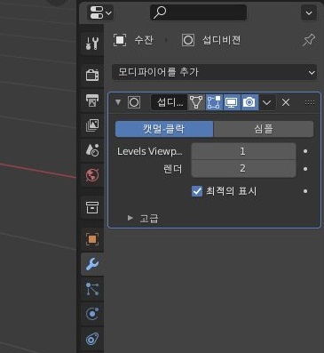 이렇게 더 부드럽게 만들어 줄 수 있는 모디파이어가 무엇이 있느냐 했더니, 위 스크린샷에서 볼 수 있는 것처럼, 일단은 섭디비젼 표면이라는 모디파이어가 있습니다.