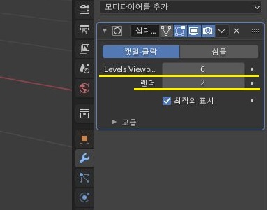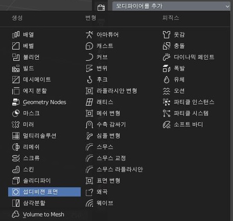 이렇게 더 부드럽게 만들어 줄 수 있는 모디파이어가 무엇이 있느냐 했더니, 위 스크린샷에서 볼 수 있는 것처럼, 일단은 섭디비젼 표면이라는 모디파이어가 있습니다.