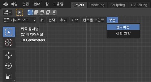 그리고 나서 어이지는 과정은 위 스크린샷에서 볼 수 있듯이 부분이라는 항목이 있는데, 이 항목은 섭디비젼이 있습니다. 이 항목으로 베지어 커브를 나누어 주도록 합니다.