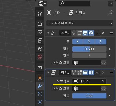 비어있는 오브젝트 항목에다가 래티스를 추가해 주는 것으로 일단 작업을 마무리 하도록 합니다. 이렇게 해서 일단은 래티스를 사용할 준비는 거의 다 되었습니다.
