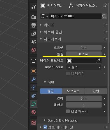 이제 베벨이란느 항목에 들어가서 기본으로 깊이가 0으로 되어 있는데, 이 항목에 대해서 0.2라고 주도록 합니다. 이렇게 주고 나서.........