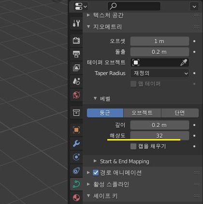 일단 제가 보는 눈이 없어서 이러는지는 모르겠지만, 해상도를 올리면 더 부드럽게 곡선이 그려진다고 하는데, 이에 대해서는 큰 차이를 모르겠습니다. 이렇게 해서 커브에 관련된 상당수의 기능을 알아보았으며, 다음으로 해야 할 것으로는 역시나........... 단면을 변형하는 것 입니다.