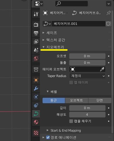 지오메트리 항목이 있는데, 이 항목에 대해서 일단은 오브셋이며 돌출이 처음에는 다 0으로 되어 있는 것을 확인할 수 있습니다.