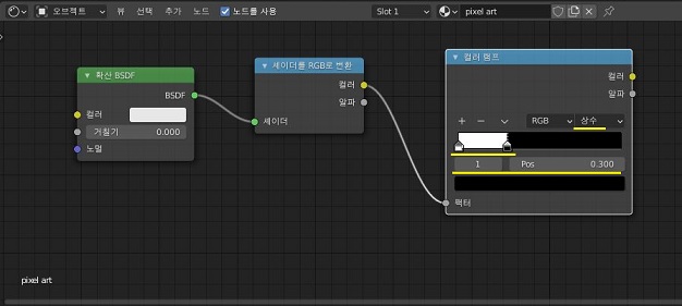 다음으로는 쉐이더를 RGB로 변환이라는 메뉴를 가지고 오도록 하고, 그 다음에는 컬러 램프라고 그냥 영문으로 colorRamp라고 있는데, 이 노드를 가지고 와서 위 스크린샷처럼 상수로 지정해 주고, Pos도 지정을 해 주도록 합니다.