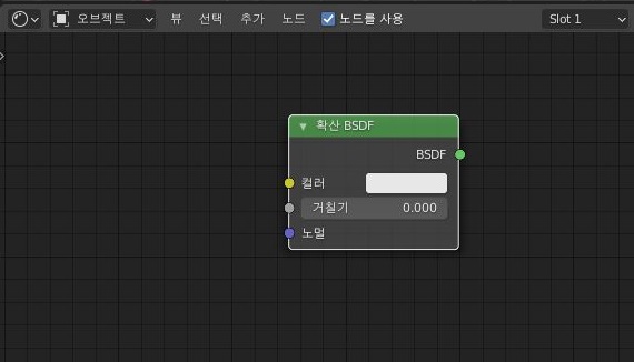 먼저 확산 BSDF를 추가해 주도록 합니다. 이런 식으로 검색해서 하나하나 추가하는 것이 빠르기는 빠른데, 아직은 우리말로 된 이름에 익숙치 않아서 매치시키는 것이 문제 입니다.