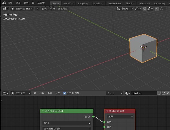 그 다음으로는 해야 할 것이 방출이라는 노드인데, 이 노드는 원래는 Emission이라는 노드입니다. 여기를 이용해서 어떻게 메테리얼 출력으로 연결시키면 1차적인 작업이 일단 끝이 납니다. 이렇게 해서 일단 다음의 작업을 진행할 수 있기는 있는데, 그래도 문제가 많이 있기는 있습니다. 사실 이걸 다 끝낸 것도 아직 픽셀아트로 완전히 분류하기에는 문제가 많이 있기는 하고요.