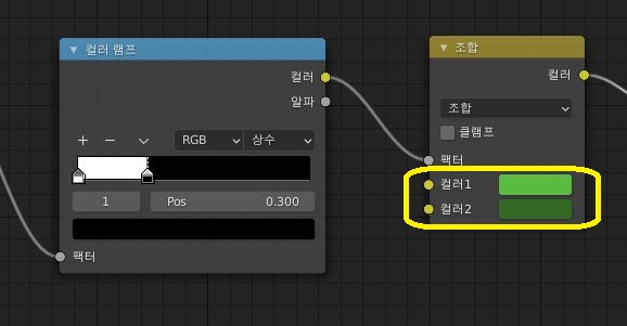 그리고 나서 조합이라는 것이 원래는 영문으로는 Mix인데, 그게 왜인지 조합으로 되어 있습니다. 이 조합이라는 것에서 1번 컬러를 지정하고 다음에는 컬러2를 지정하는데, 명도를 떨어트려서 주로 그림자를 나타내는데 사용이 됩니다.