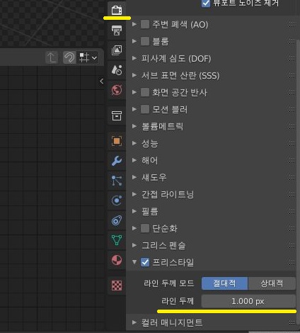 먼저 저 카메라 모양의 아이콘을 일단 클릭해서 우선 위 스크린샷에서 볼 수 있는 것처럼, 라인 두께를 다시 1로 복귀시키도록 했습니다.