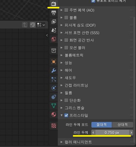 그래서 이번에는 라인 두께를 위 스크린샷에서 볼 수 있는 것처럼 일단 0.75로 맞추어 주었습니다. 이렇게 하면 어떤 변화가 나올지 모르겠습니다만...........