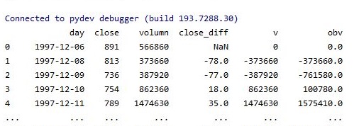 무어라 하기는 힘들지만, 아무튼 어떻게 해서 데이터를 가지고 와서, 이를 가지고서 가공한 다음, OBV지수를 계산하는 것 까지는 어떻게 성공했습니다. 다만, 문제가 있다면, 여기까지 확보를 한 것이지, 이를 머신러닝까지 적용하기 위해서는 상당히 힘든 과정이 남아 있다고 해야 겠습니다.