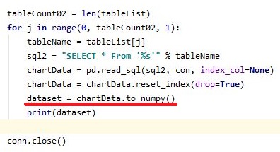 그리고 나서 데이터 셋을 일단 numpy의 형식으로 변형해야 하는 것이 있습니다. 이 작업을 하기 위해서 우선 밑줄을 친 코드를 추가해 주었습니다.