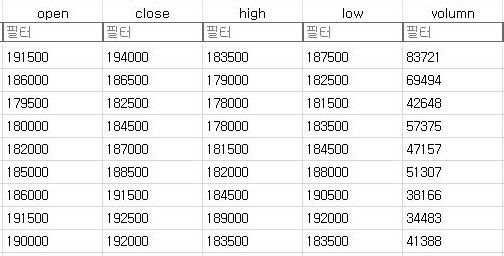 이렇게 해서 일단 전반부를 보여주고 있는데 기존의 일봉차트를 구성하는데 필요한 모든 자료가 다 들어가 있는 것을 확인할 수 있었습니다.