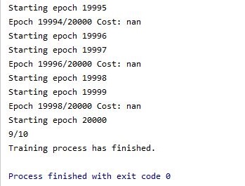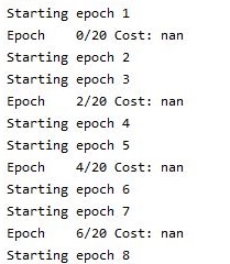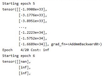 그리고 나서 여기서도 학습이 제대로 이루어졌는지 한번 보기 위해서 cost값을 봤지만, 예측과 실제 타겟의 값차이를 수정하는 메서드에서 어째서 인지 계속해서 nan을 내놓는데, 입력된 값이 적절하지 않다는 의미가 됩니다.