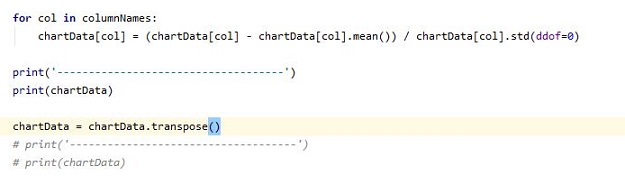 먼저 선택한 방법은, z-score라고 해서, 일단 하나하나 column의 값을 평균에서 빼준다음, 이 값을 표준편차로 나누어 주는 것으로 실행하였습니다.