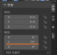 변환으로 회전을 시키는데, 겨우겨우 어떻게 해서 윗꺼풀이 뒤로 75도 기울어 지게 하는데는 성공했습니다. 그렇게 해서 나온 결과는.........