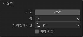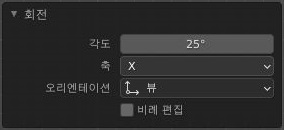 그리고 나서 일단은 해 주어야 하는 것이 우선, 에디트 모드로 들어가서 R키를 누르고 엔터를 쳐서 위 화면의 메뉴를 불러오는 것 입니다. 이 화면을 이용해서, 일단 각도를 25도 회전시켜 주도록 합니다.