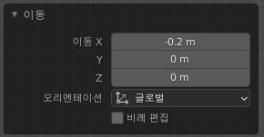 G키를 눌러서 바로 엔터를 치는 것으로 위 스크린샷에서 보이는 것처럼 하나 가지고 오도록합니다. 이렇게 하나 가지고 오는 것으로 X축으로 -0.2m 이동을 시켜 보도록 합니다.