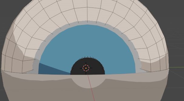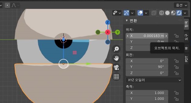 그리고 나서 다음으로 진행해 보고자 하는 것으로는 역시 너무 둥근 눈알을 써서 이런 문제가 생긴 것인가 싶어서, 이번에는 위 스크린샷에서 볼 수 있는 것처럼, 일단 납작한 편의 눈을 만들어서 한번 웃는 얼굴을 만들어 보고자 합니다.