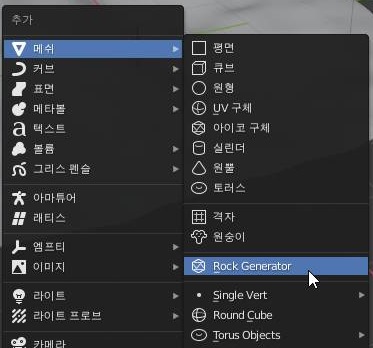 먼저 오브젝트 모드로 가서, 위 스크린샷에서 볼 수 있는 것처럼, 일단은 돌 생성기라는 것이 새로 생겼는데, 이걸 선택해 주도록 합니다.