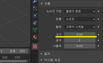 그리고 나서 크기를 위 스크린샷에서 보여주고 있는 대로, 일단 0.50으로 두어서 한번 부르럽고 완만하게 지형지물의 높낮이가 있도록 설정해 봅니다.