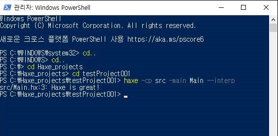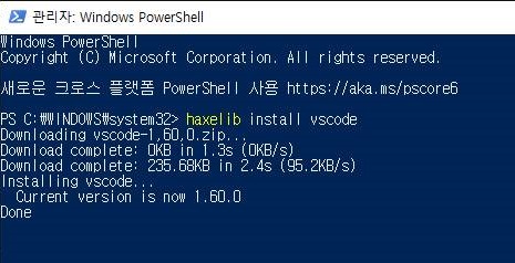 그리고 나서 당므으로 진행하고자 하는 것은, 일단 haxelib이라는 명령어를 microsoft power shell에서 실행시켜서, 해당하는 코드를 일단 인스톨해 주도록합니다.