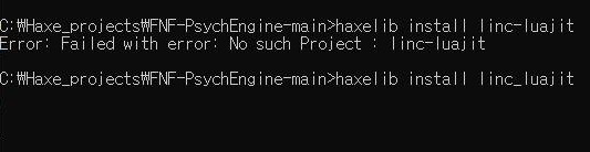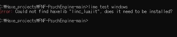 이게 다 luajit를 설치하지 않아서 벌어진 에러인데, 일단 이 에러를 처리하기 위해서 luajit를 설치해 주도록 합니다. 그리고 나서 cmd창에서 lime test windows를 입력해서 사이크엔진을 작동시켜 보도록 합니다.