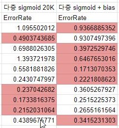 그냥 시그모이드 2000에포크와 비교해서 상당히 우수한 성능을 보여주고 있는 것을 확인할 수 있기는 있습니다. 그럼 여기서 더 의문인 것을 해보도록 합니다.