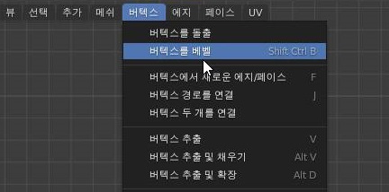 그리고 지금까지는 몰랐는데, ctrl + shift + B키를 누르거나, 위 스크린샷에서 보이는 것처럼 버텍스를 베벨이라는 항목을 눌러서 어떻게 모서리를 깍도록 합니다.