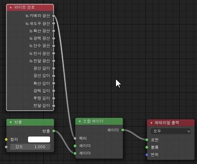그리고 이 조합 셰이더에 라이트 경로라고 있는데, 다른게 아니라 light path라는 영어명칭을 가지고 있는 이 노드를 추가해서, 가장 상단의 is 카메라 광선을 조합 셰이더의 팩터에 연결해 주도록 합니다.