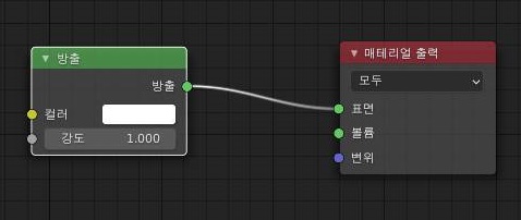 일단 기존의 BSDF는 지우고, 방출 노드를 가지고 와서 표면과 연결해 주도록 합니다. 이게 겨우 시작일 뿐이고, 조금 지나면 상당히 복잡한 노드의 연결이 시작됩니다.