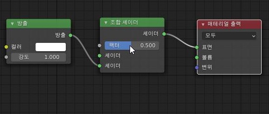 방출 이전에 조합 셰이더라는 노드가 있는데, 이걸 추가해 주어서 둘 사이에 연결하는 수단으로 일단 만들어 주도록 합니다.