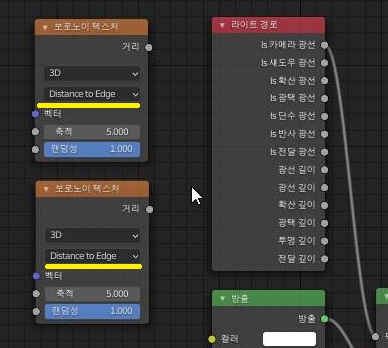 먼저 아랫쪽 보로노이 텍스처에 방출의 컬러와 연결을 해 주도록 합니다. 이렇게 하도록 해서, 이제 한쪽 파트는 끝나기는 끝이 났습니다.