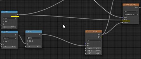 다음으로는 복잡하게도 윗쪽 수학 노드에서 아랫쪽 보로노이 텍스쳐 노드의 축적에다가 위 스크린샷에서 보이는 것처럼 일단 연결을 해 주도록 합니다. 상당히 먼 거리를 이동해야 했습니다.